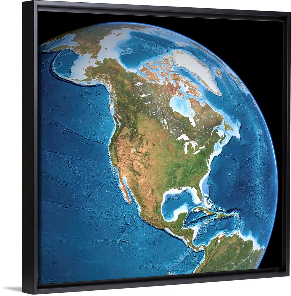 <p>North America, topographic map. Highlands and lowlands of the continents are also shown, as ridges and flat areas. South America (bottom right) and the Arctic (top) are also seen, along with the Atlantic Ocean (right) and the Pacific Ocean (left). The seabed depth varies from shallow (light blue) on the continental shelves, to deep ocean basins (dark blue). Topographic and bathymetric data is usually gathered by using aerial and satellite imagery combined with radar and sonar mapping. The satellites in this case were NOAA's POES satellites.</p>