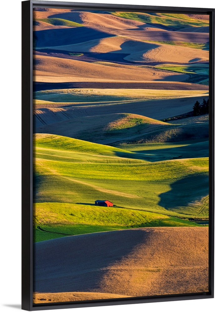 <p>North America, USA, Washington, Red Barn in Fields of Spring and Winter Wheat</p>