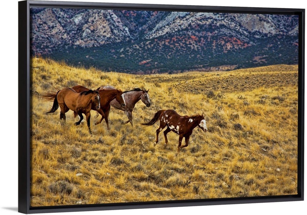 <p>North America, USA, Wyoming, Shell, Big Horn Mountains, Horses Running in Field.</p>