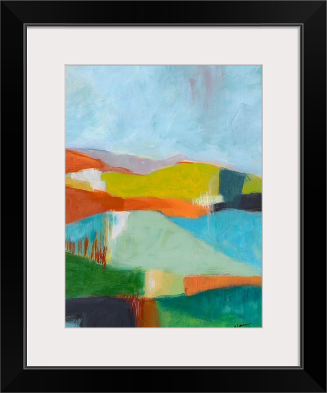 <p>Contemporary painting of a colorful, abstract landscape with rolling hills.</p>