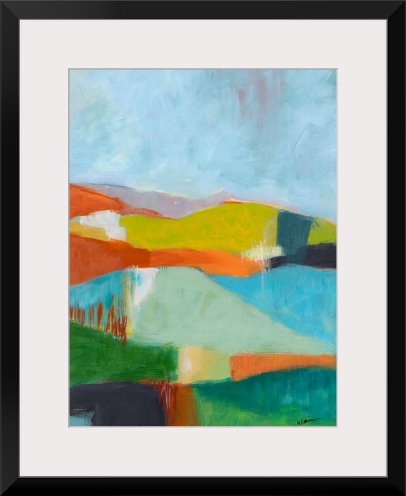 <p>Contemporary painting of a colorful, abstract landscape with rolling hills.</p>