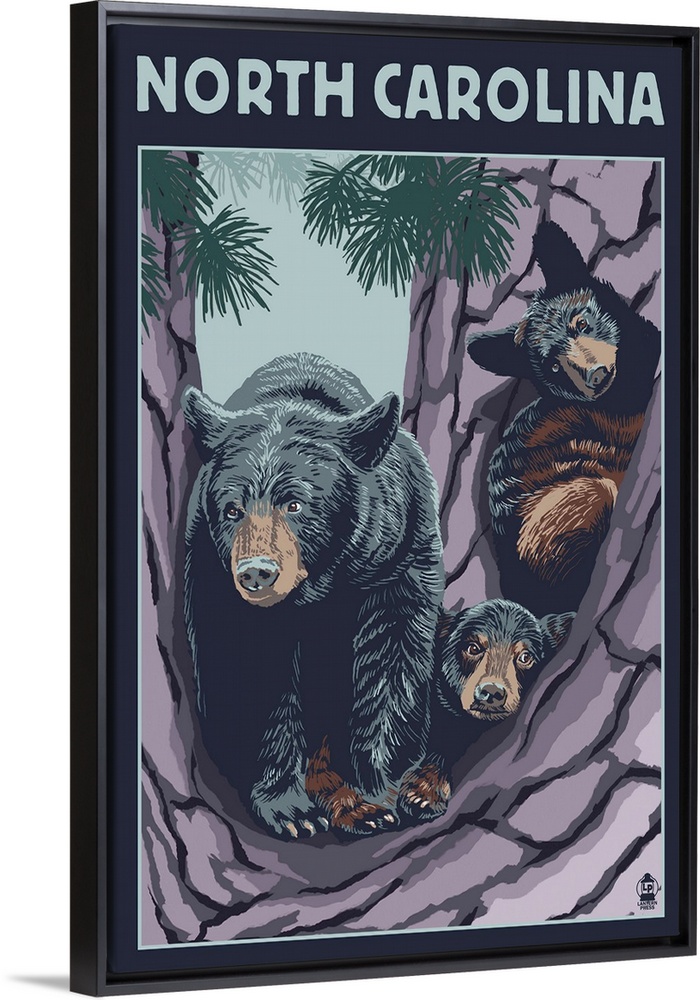 <p>Retro stylized art poster of a black bear mother with her two cubs in a tree.</p>