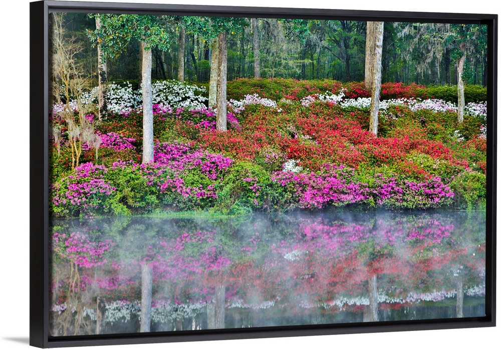 <p>United States, North Carolina, Charleston, Middleton Place, Azaleas Reflecting in the Lake</p>