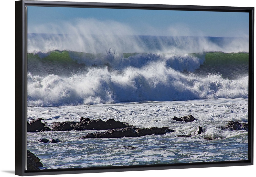 <p>Photograph of a big dramatic wave crashing over rocks in North Cayucos, California.</p>