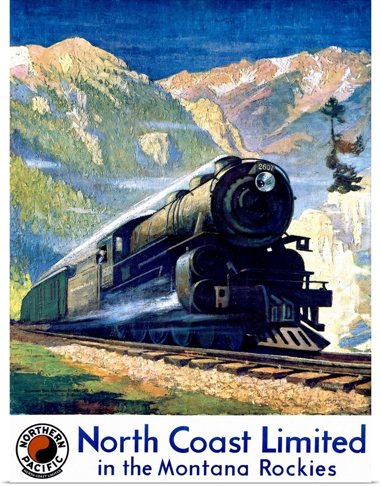 <p>Vertical, vintage, travel advertisement on a big canvas for Northern Pacific, of the North Coast Limited Railroad in the Montana Rockies. A steam train speeds ahead on the tracks, in front of a mountain landscape, beneath a blue sky.</p>