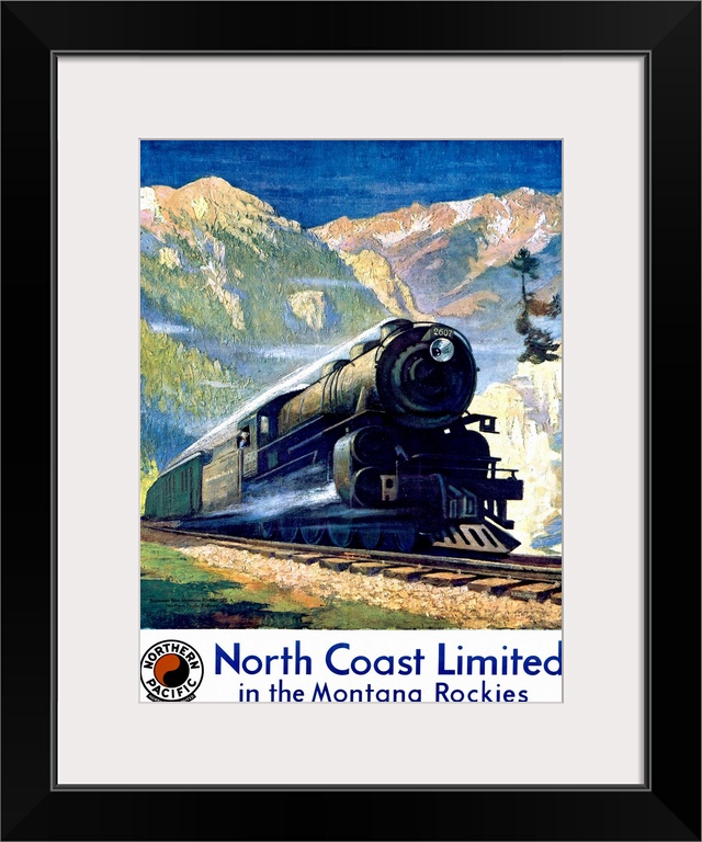 <p>Vertical, vintage, travel advertisement on a big canvas for Northern Pacific, of the North Coast Limited Railroad in the Montana Rockies. A steam train speeds ahead on the tracks, in front of a mountain landscape, beneath a blue sky.</p>
