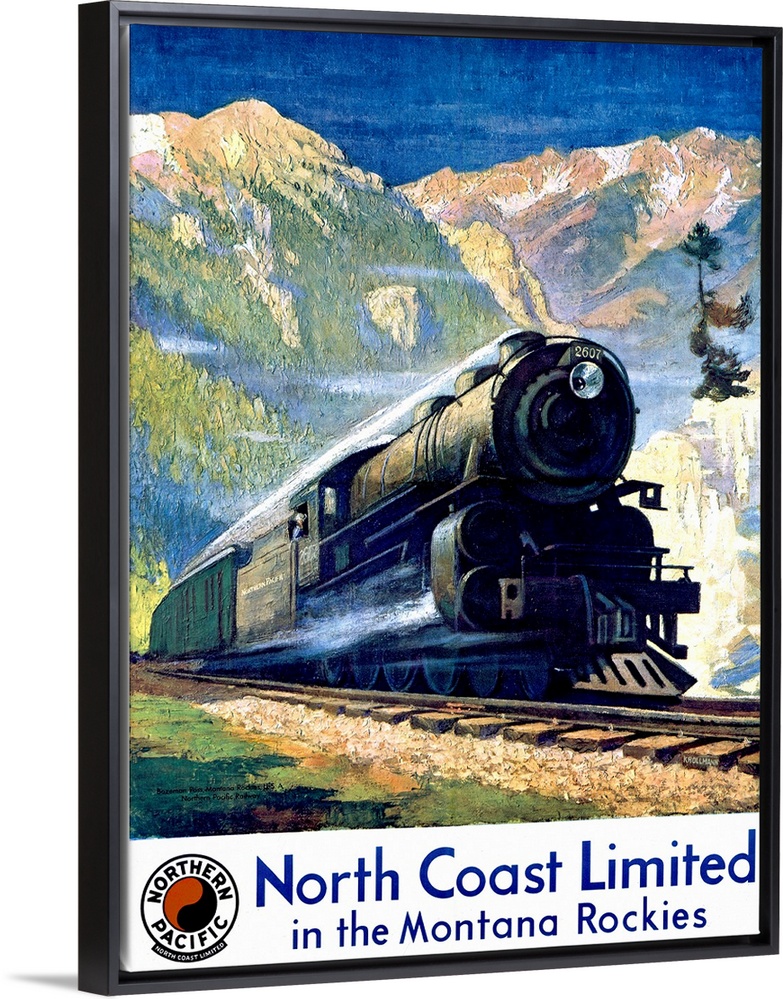 <p>Vertical, vintage, travel advertisement on a big canvas for Northern Pacific, of the North Coast Limited Railroad in the Montana Rockies. A steam train speeds ahead on the tracks, in front of a mountain landscape, beneath a blue sky.</p>