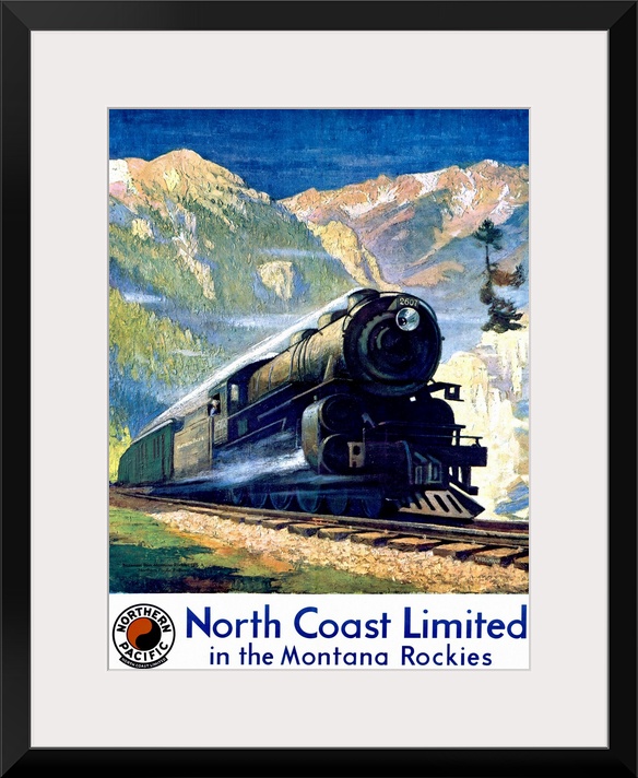 <p>Vertical, vintage, travel advertisement on a big canvas for Northern Pacific, of the North Coast Limited Railroad in the Montana Rockies. A steam train speeds ahead on the tracks, in front of a mountain landscape, beneath a blue sky.</p>