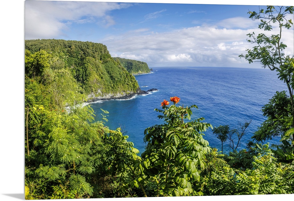 <p>An African tulip tree, Spathodea campanulata, blooms in the foreground of this scene on the road to Hana, Maui, Hawaii, USA. The road to Hana is 52 miles long, and can take from two hours to two-and-a-half hours depending on how often you stop.</p>