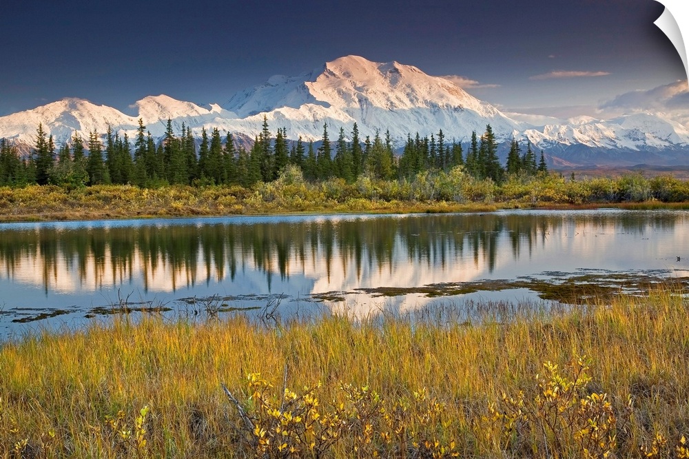 <p>The north face of Denali is reflected in a small tundra pond in Denali National Park, Alaska. Fall 2008.</p>