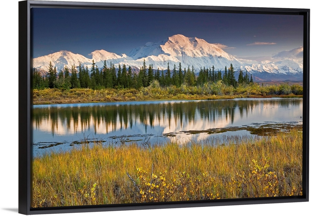 <p>The north face of Denali is reflected in a small tundra pond in Denali National Park, Alaska. Fall 2008.</p>