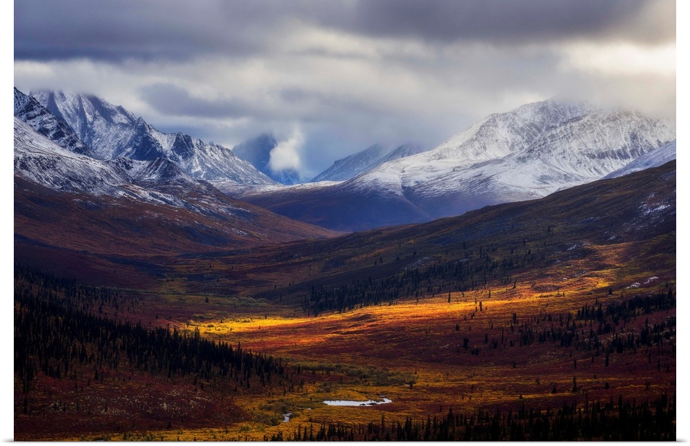<p>Storm clouds part allowing light to illuminate the landcape in the North Klondike Valley along the Dempster Highway in northern Yukon. Yukon, Canada.</p>