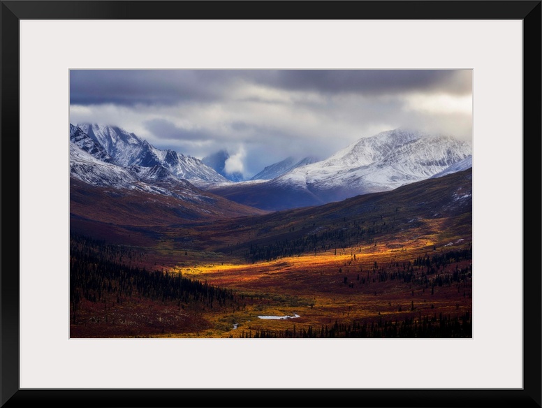 <p>Storm clouds part allowing light to illuminate the landcape in the North Klondike Valley along the Dempster Highway in northern Yukon. Yukon, Canada.</p>