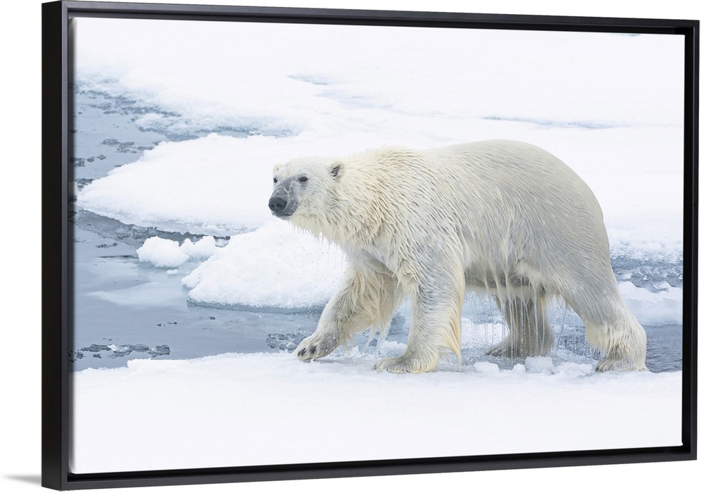 <p>North of Svalbard, pack ice. A polar bear emerges from the water.</p>