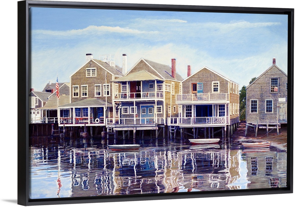 <p>Houses on harbor wharf with dock and moored boats.</p>