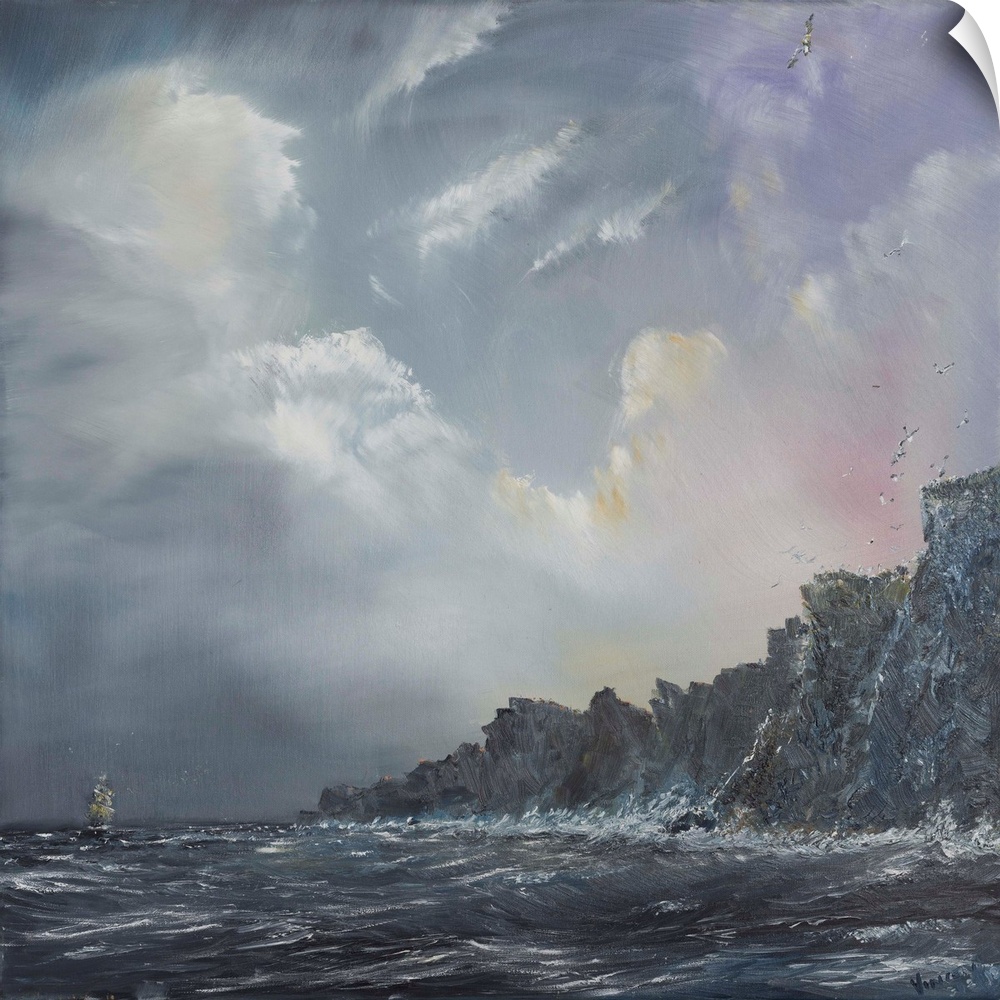 <p>Contemporary painting of a ship out to sea near cliffs of a coast.</p>