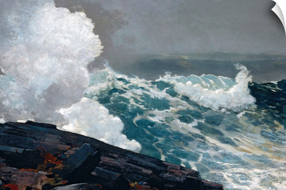 <p>On the Maine coast, a nor'easter is a storm of exceptional violence and duration. When Homer first showed this canvas in 1895, it included two men in foul-weather gear crouching on the rocks below a smaller column of spray. Even though the painting was well received and purchased by a leading collector of American art-George Hearn, who later donated it to the Metropolitan Museum-Homer reworked it to powerful effect.</p>