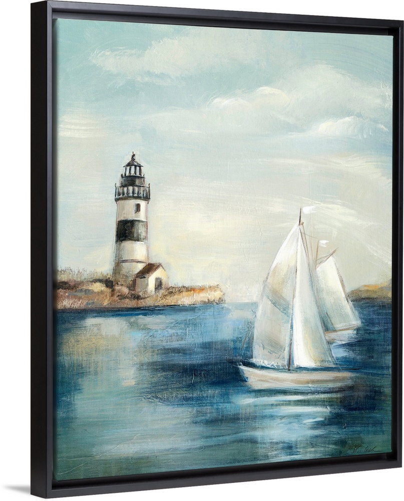<p>Contemporary painting of an idyllic coastal scene, with a lighthouse in the background and a sailboat in the foreground.</p>