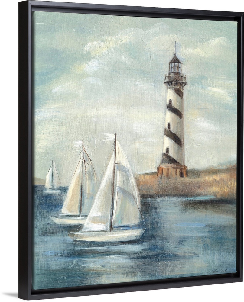 <p>Contemporary painting of an idyllic coastal scene, with a lighthouse in the background and sailboats in the foreground.</p>