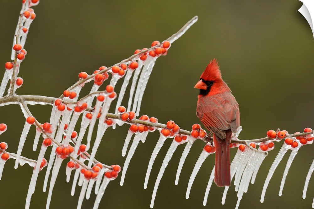 <p>Northern Cardinal (Cardinalis cardinalis), adult male perched on icy branch of Possum Haw Holly (Ilex decidua) with berries, Hill Country, Texas, USA</p>