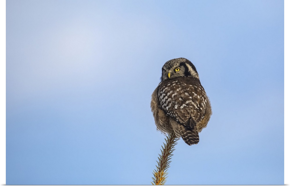 <p>Northern Hawk Owl (Surnia ulula), known for sitting on the highest perch possible while looking for prey such as voles moving below. This one sits on the top of a tree against a blue sky, South-central Alaska; Anchorage, Alaska, United States of America</p>