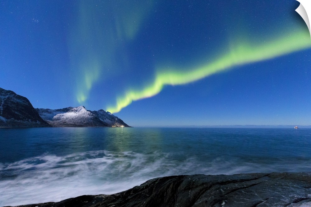 <p>Northern lights above Steinfjorden. Tungeneset, Ersfjorden, Senja, Norway, Europe.</p>