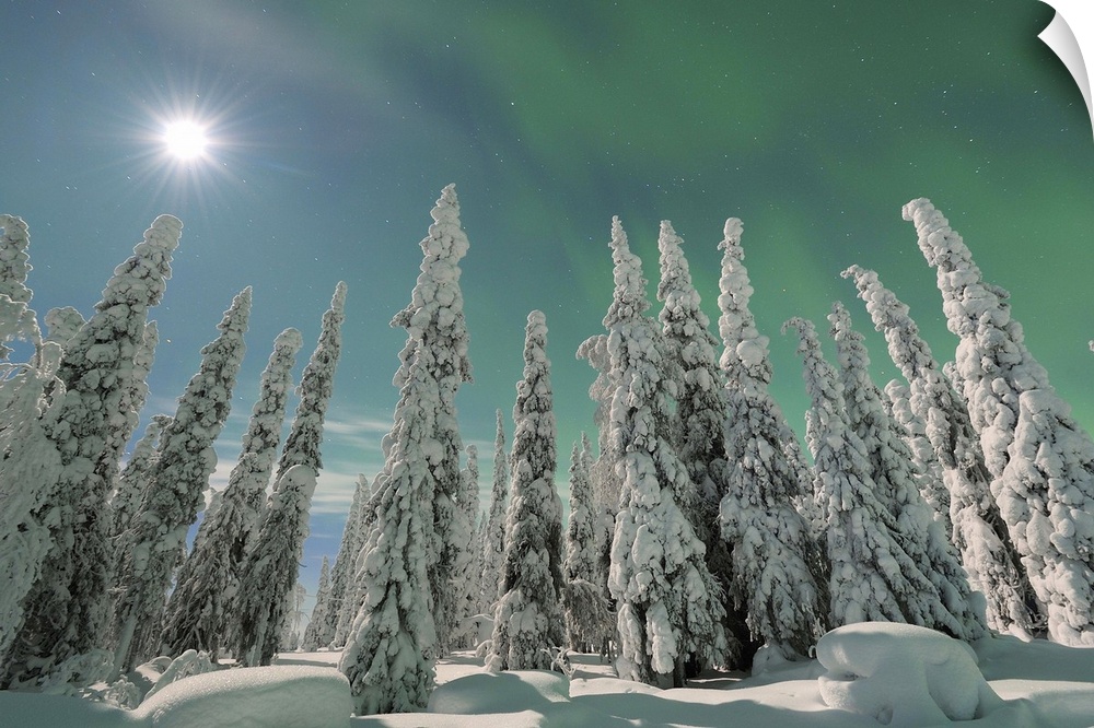 <p>Northern lights and full moon, Aurora Borealis, Winter, Nissi, Kuusamo, Nordoesterbotten, Suomi, Finland</p>