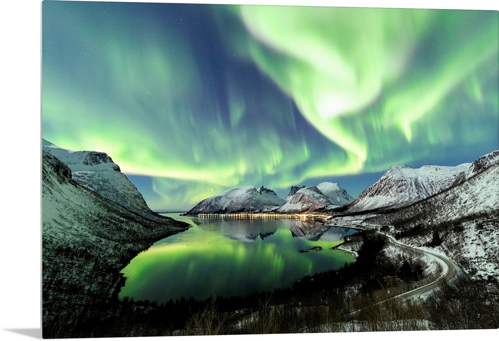 <p>Northern lights and stars light up the snowy peaks reflected in the cold sea Bergsbotn Senja Troms Norway Europe</p>