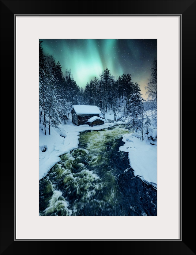 <p>Northern lights over Myllykoski Mill and Myllytupa gorge at Oulanka National Park in winter, Oulu, Finland</p>