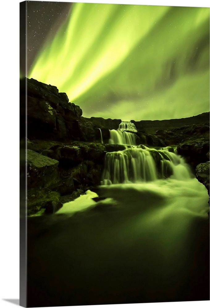 <p>Northern Lights, or Aurora Borealis, glowing over waterfalls and a stream; Iceland</p>
