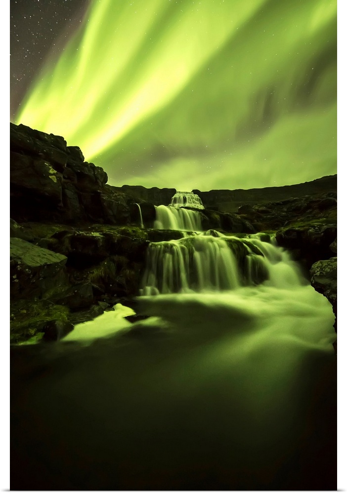 <p>Northern Lights, or Aurora Borealis, glowing over waterfalls and a stream; Iceland</p>