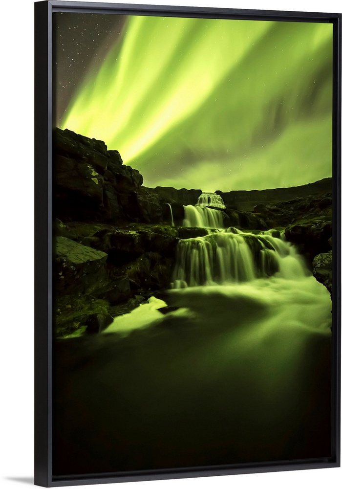<p>Northern Lights, or Aurora Borealis, glowing over waterfalls and a stream; Iceland</p>