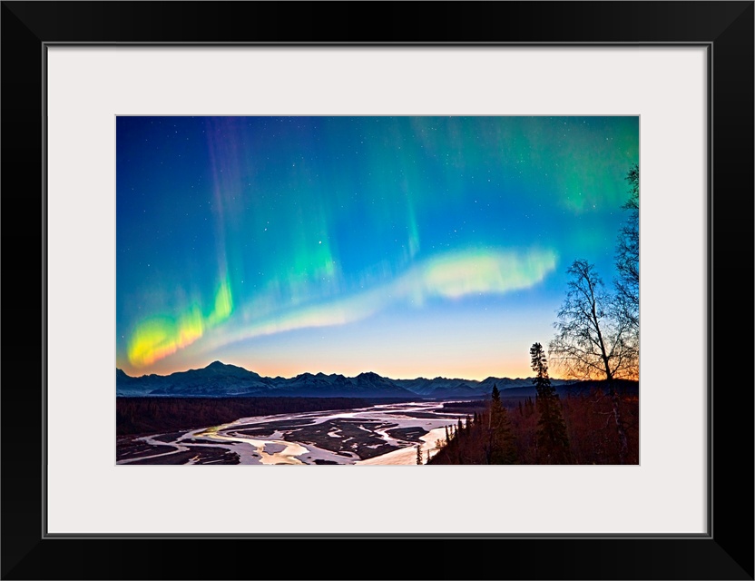 <p>Northern Lights in the sky above Mount McKinley and the Alaska range at twilight with the glow from the setting sun low on the northern horizon, Chulitna River in the foreground, Denali State Park, early spring, Southcentral Alaska, USA. HDR image</p>