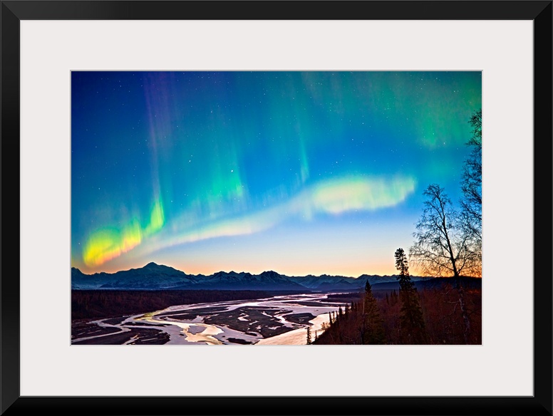<p>Northern Lights in the sky above Mount McKinley and the Alaska range at twilight with the glow from the setting sun low on the northern horizon, Chulitna River in the foreground, Denali State Park, early spring, Southcentral Alaska, USA. HDR image</p>