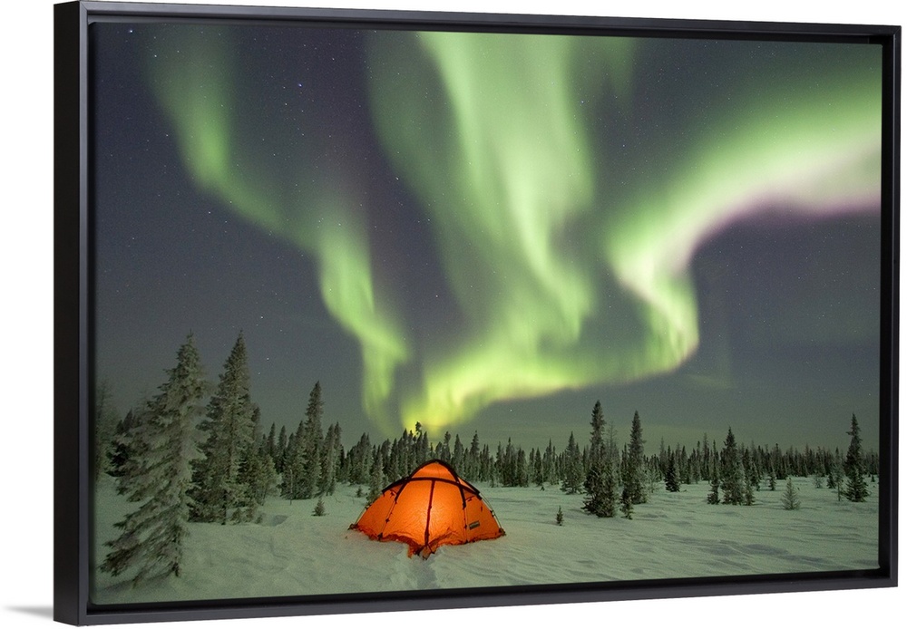 <p>This beautiful picture is taken of the northern lights over a campsite surrounded by snow covered pine trees.</p>