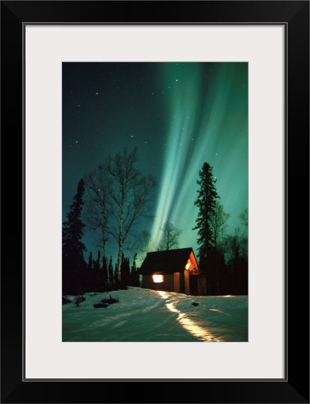 <p>A photograph of the Aurora Borealis wisps in starry sky above a small cabin in the snow.</p>