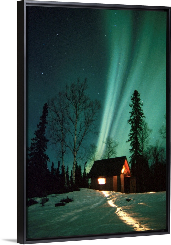 <p>A photograph of the Aurora Borealis wisps in starry sky above a small cabin in the snow.</p>