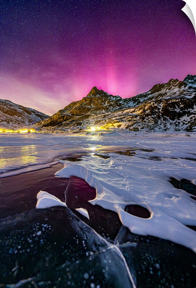 <p>Northern Lights over the village of Montespluga and frozen lake, Madesimo, Valtellina, Lombardy, Italy</p>