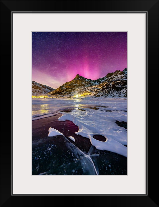 <p>Northern Lights over the village of Montespluga and frozen lake, Madesimo, Valtellina, Lombardy, Italy</p>