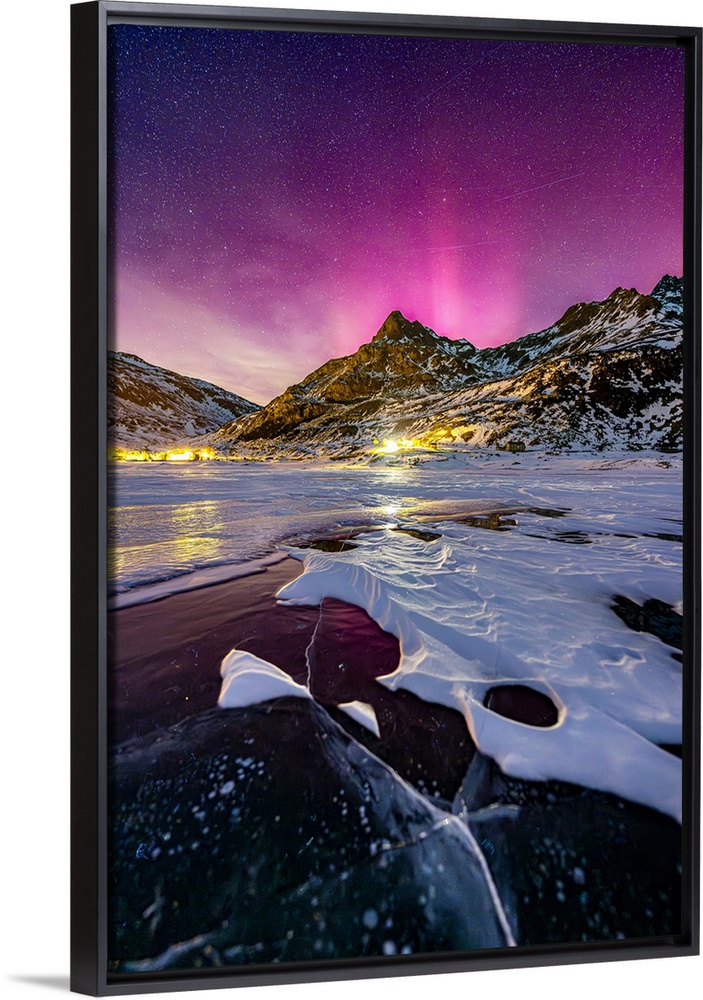 <p>Northern Lights over the village of Montespluga and frozen lake, Madesimo, Valtellina, Lombardy, Italy</p>