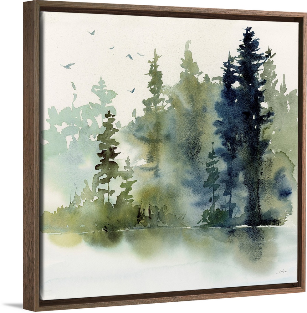 <p>An abstracted contemporary watercolor painting of tall evergreen trees in a misty forest with a lake in the foreground</p>