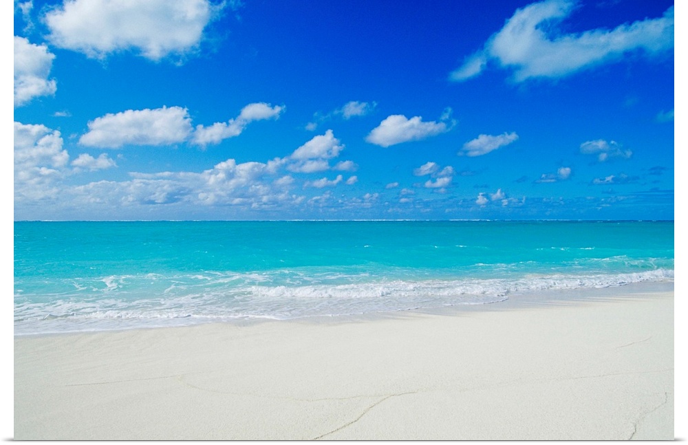 <p>Photograph of white sandy beach and crystal clear blue waters on a calm, clear day in Hawaii.</p>
