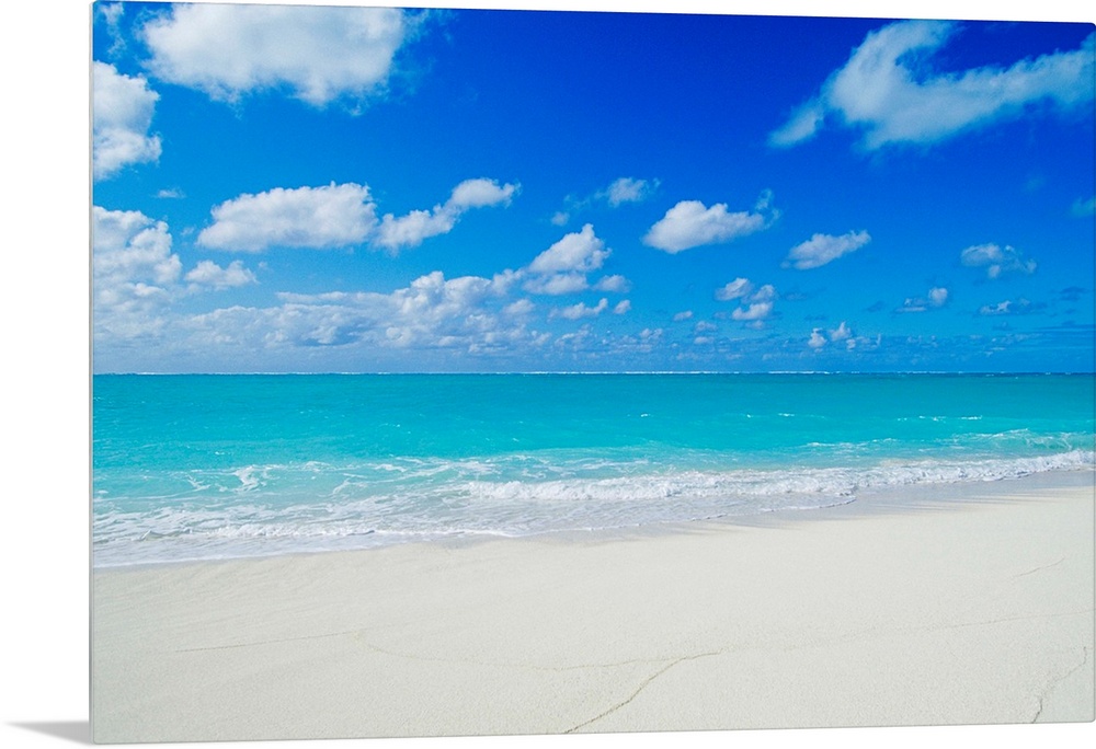 <p>Photograph of white sandy beach and crystal clear blue waters on a calm, clear day in Hawaii.</p>