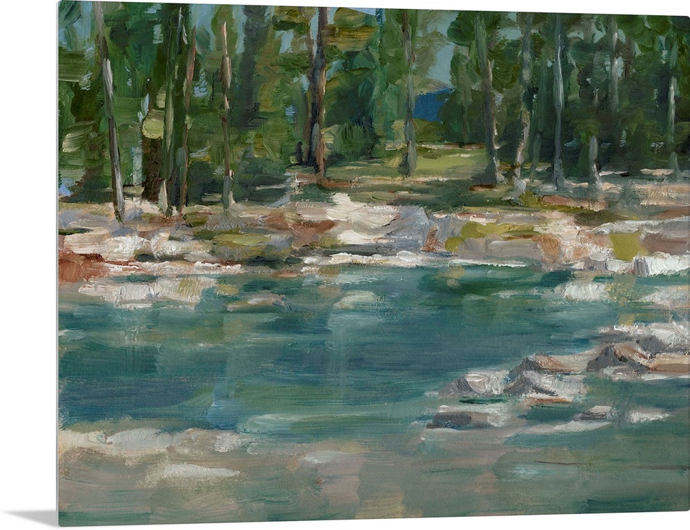 <p>Contemporary abstract painting of a lake or pond in a clearing in a wooded area.</p>