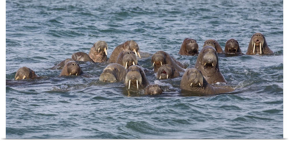 <p>Norway, Arctic, Svalbard, Kvitoya, Andreeneset. A herd of curious Atlantic walruses. These moustached, long-tusked marine mammals are found near the Arctic circle.</p>