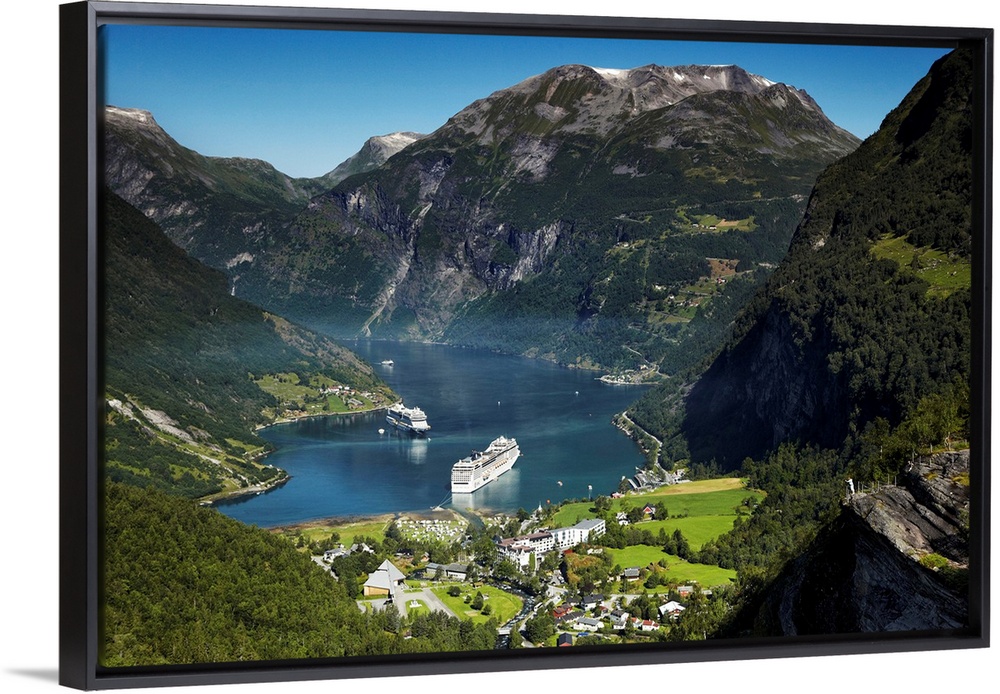 <p>Norway, More og Romsdal, Scandinavia, Fjords, Geirangerfjord, Geiranger, Flydalsjuvet Rock and cruise ships in Geirangerfjord.</p>