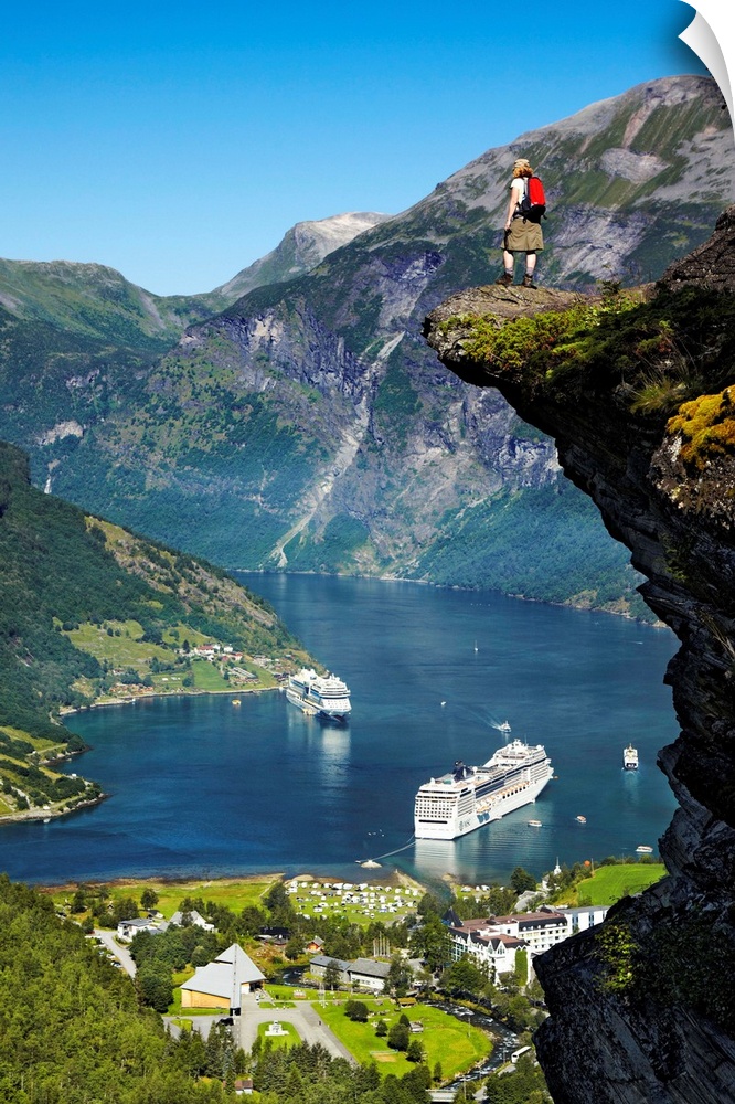 <p>Norway, More og Romsdal, Scandinavia, Fjords, Geirangerfjord, Geiranger, Hiker at Flydalsjuvet Rock and cruise ships in Geirangerfjord.</p>