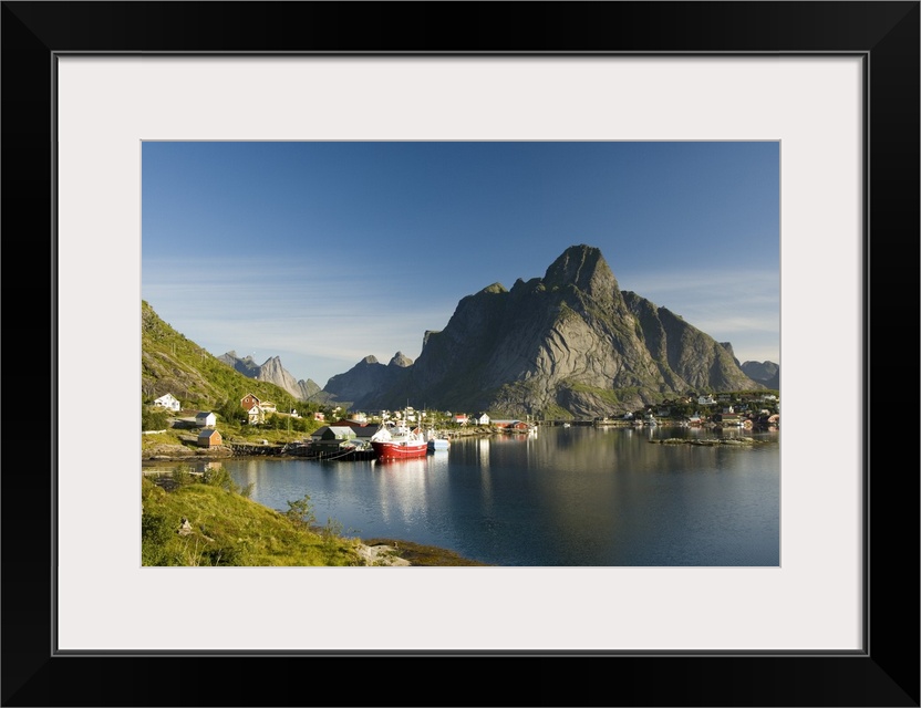 <p>Europe, Norway, Lofoten. The community of Reine below the glacially sculped peak Olstinden.</p>