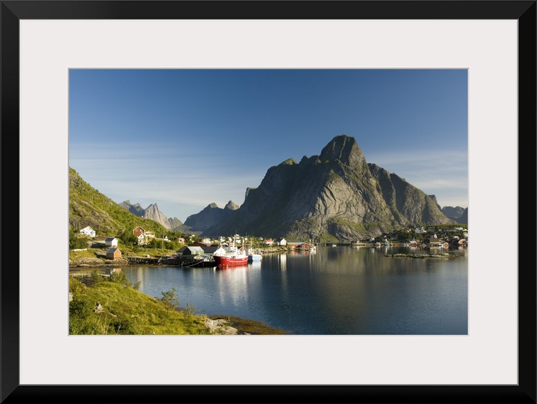 <p>Europe, Norway, Lofoten. The community of Reine below the glacially sculped peak Olstinden.</p>