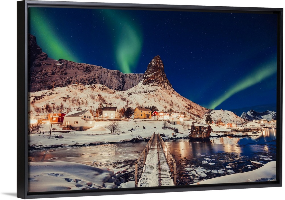 <p>Norway, Nordland, Lofoten Islands, Moskenesoya, Scandinavia, The northern lights appear in the sky above Reine village in Lofoten islands on a winter night with the mountains covered with snow</p>